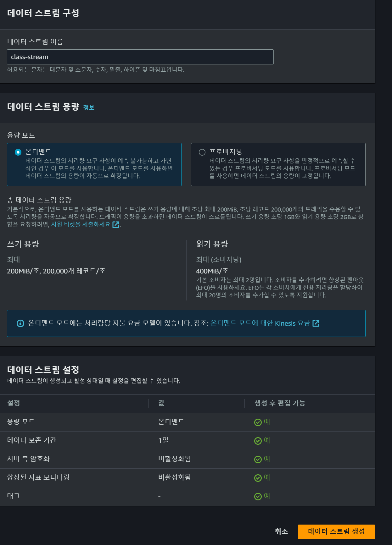이름은 API에서 구성한 "StreamName" : "class-stream" 을 입력해준다.